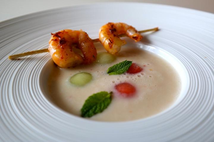 Mal wieder was von EAT & MORE, eine tolle erfrischende Suppe, für heiße Tage. Geeiste Melonen Suppe mit Garnelen-Spieß.